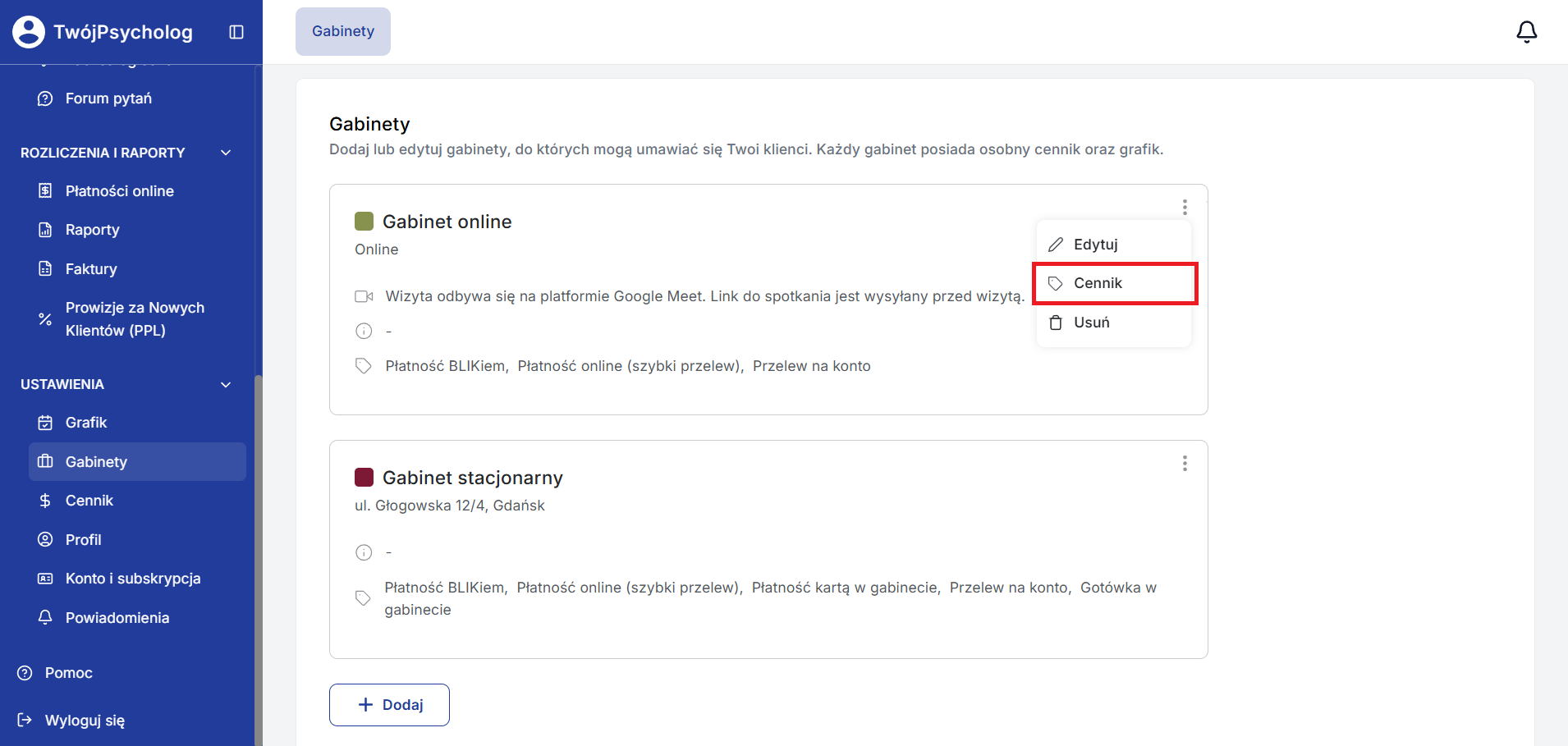 Aby szybko sprawdzić przypisany do danego gabinetu cennik usług, kliknij ikonę trzech kropek przy danym gabinecie, a następnie przycisk “Cennik”.