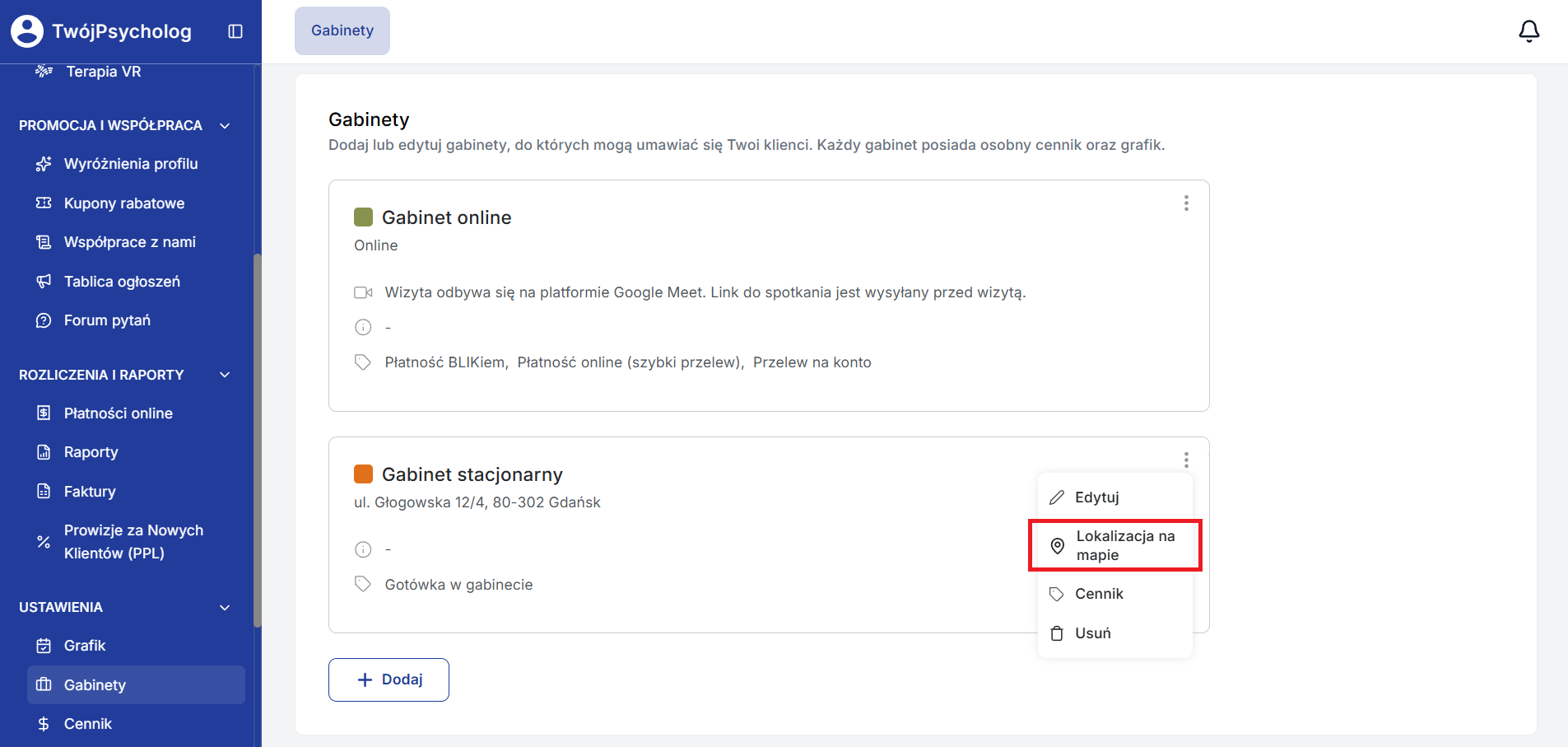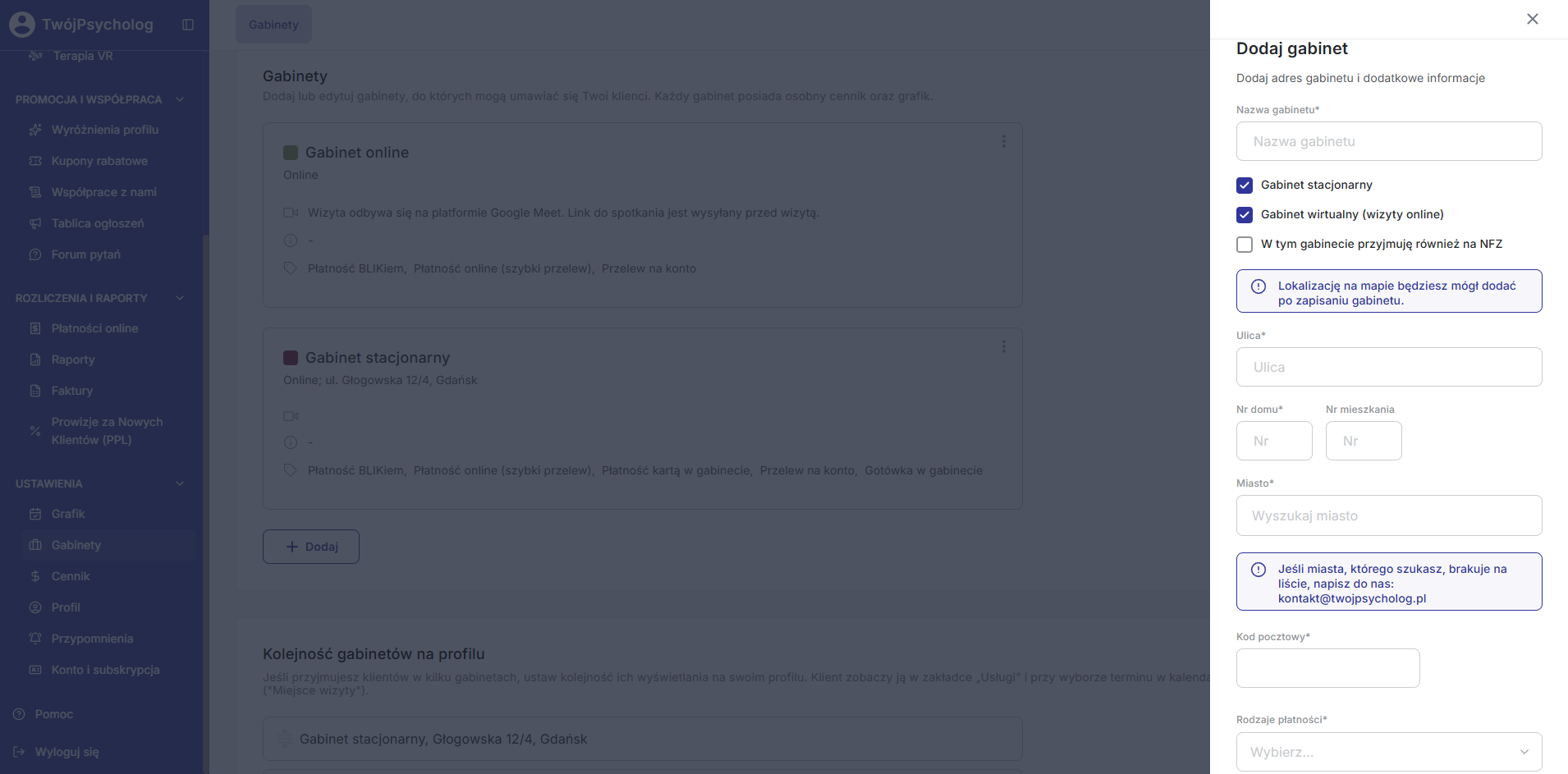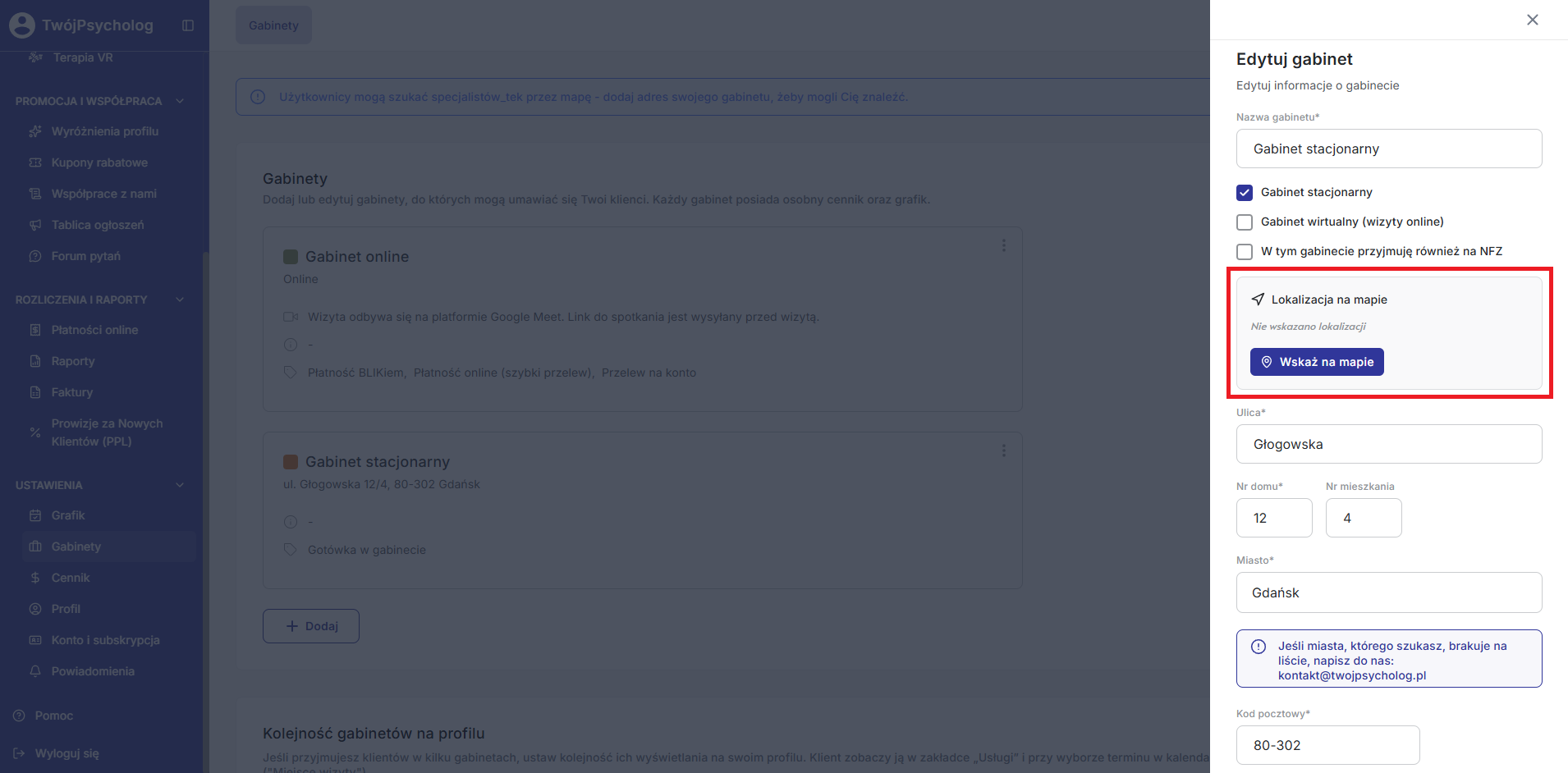 W przypadku zaznaczonej opcji “Gabinet stacjonarny” masz możliwość dodania lokalizacji gabinetu na mapie.