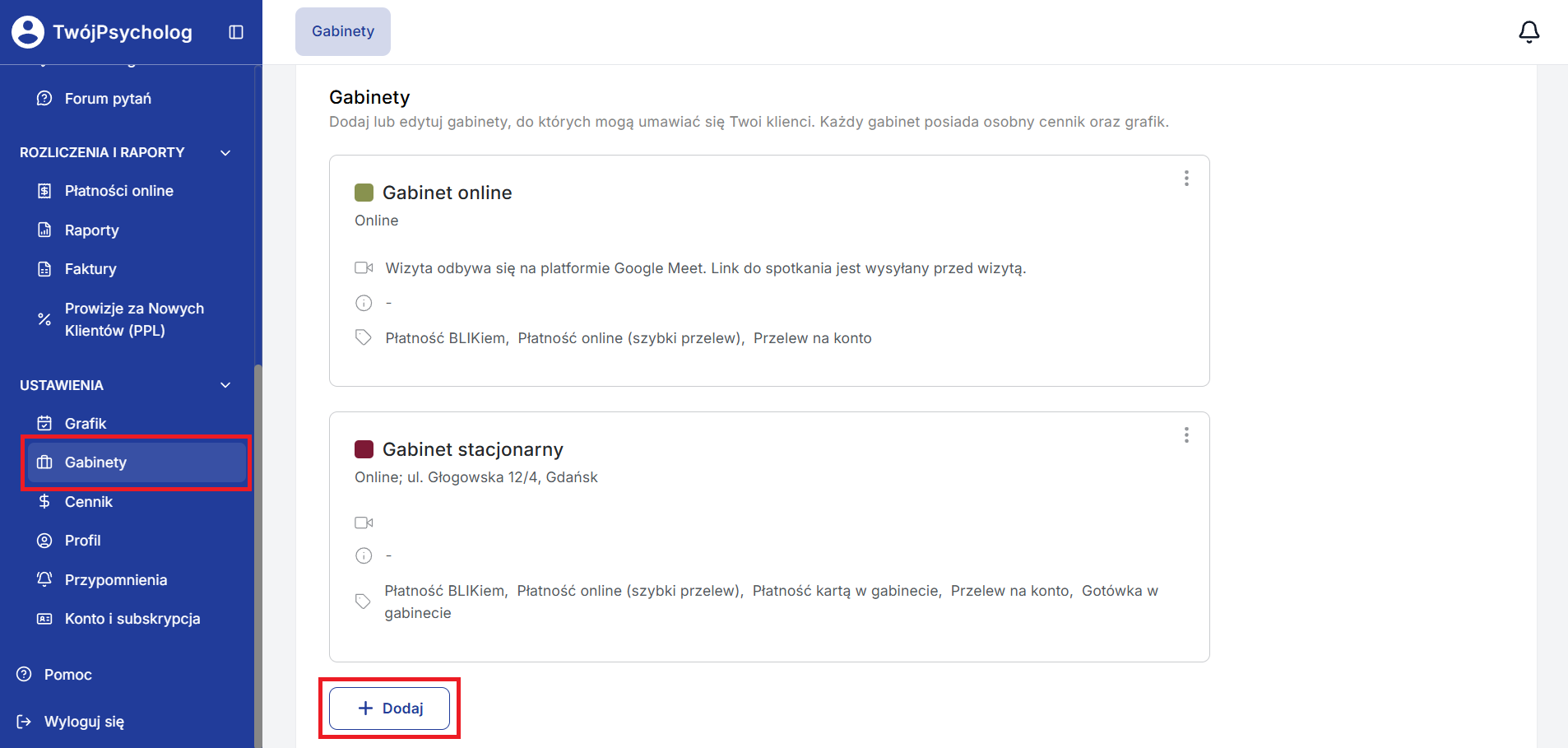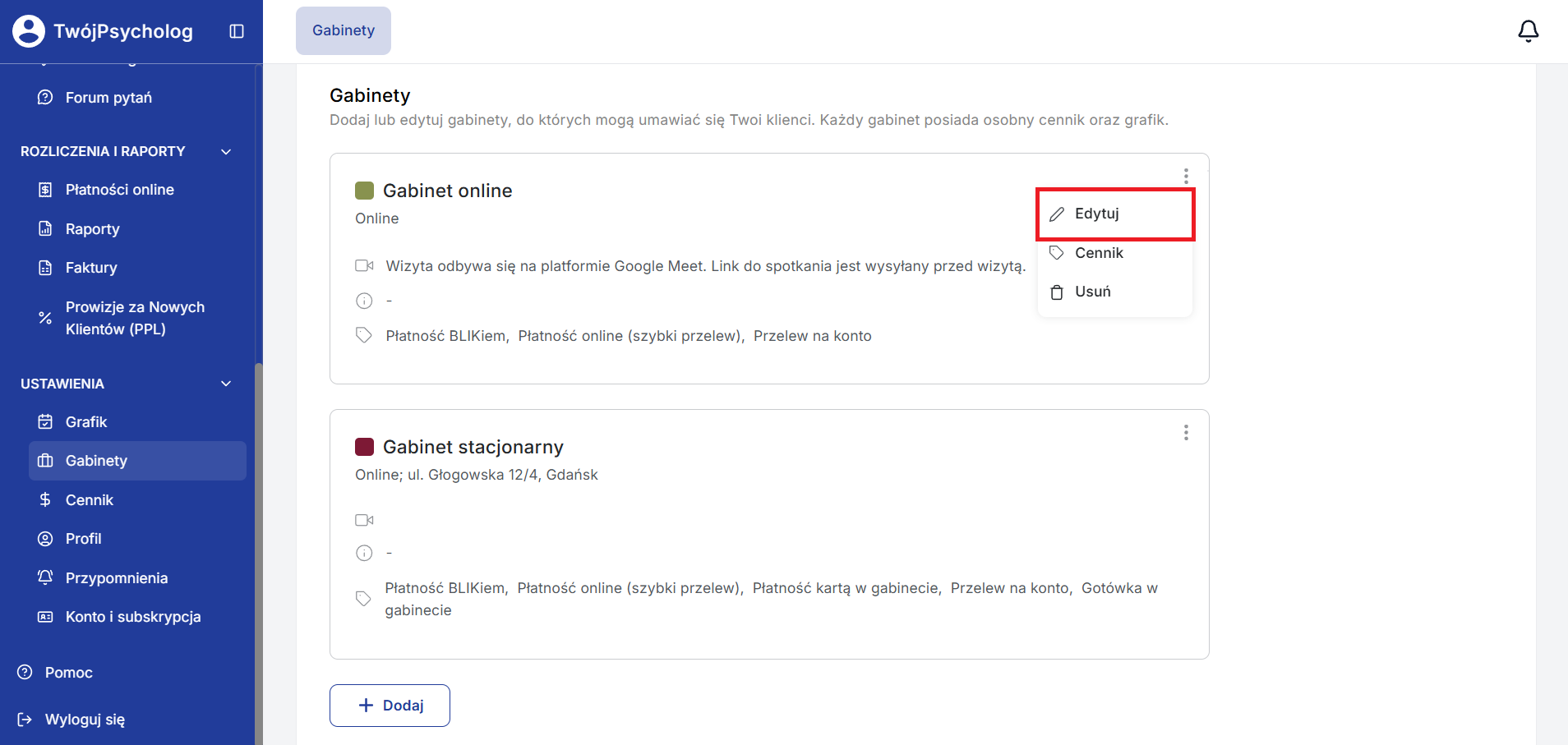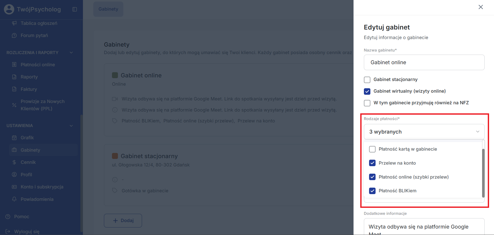 Dzięki temu możesz, np. określić różne metody płatności w zależności od rodzaju gabinetu (online/stacjonarny).