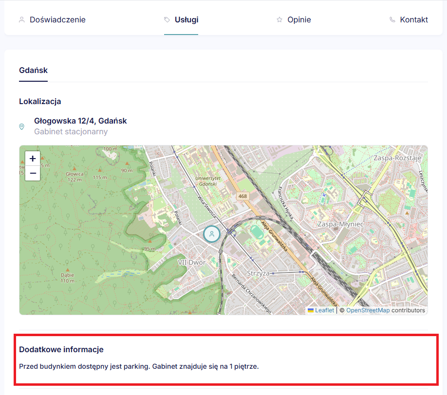 Informacje, które wpiszesz w tym polu, zostaną wyświetlone na Twoim profilu, w zakładce “Usługi” - pod lokalizacją Twojego gabinetu: