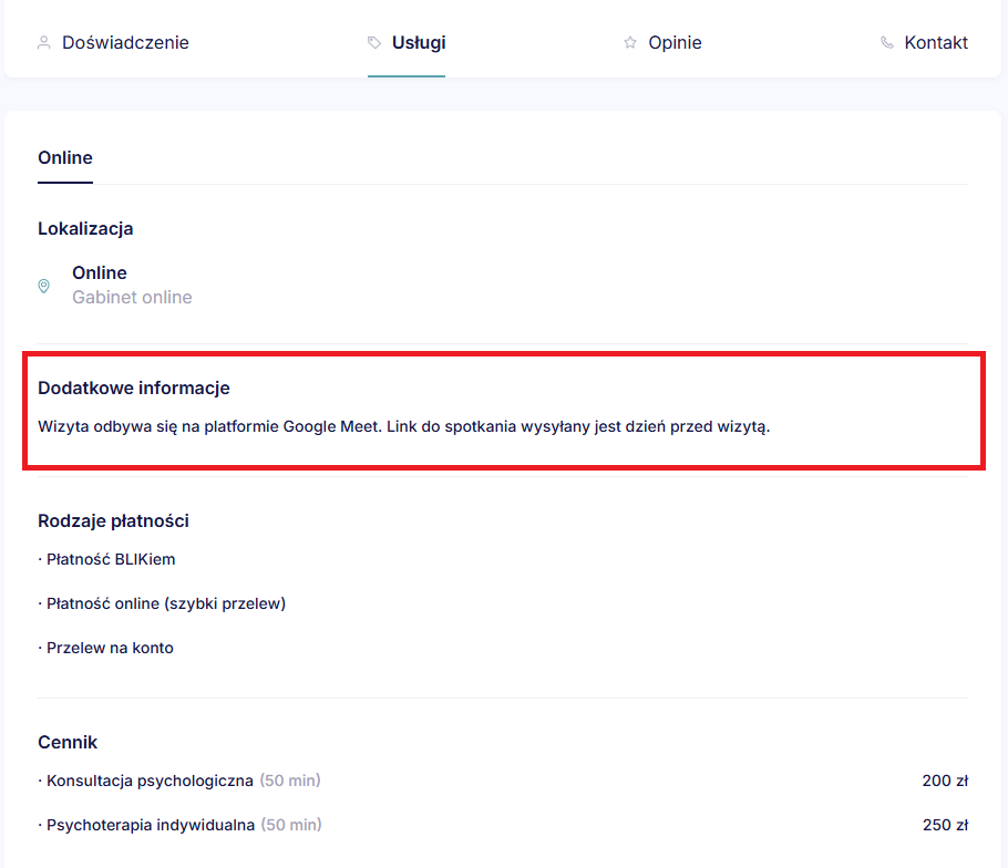 W polu “Dodatkowe informacje” możesz umieścić wskazówki dla Klienta_tki, np. dotyczące dojazdu, klatki lub piętra, które ułatwią Klientowi_tce dotarcie do Twojego gabinetu (w przypadku gabinetu stacjonarnego) lub informacje o sposobie połączenia lub płatności za wizytę (w przypadku gabinetu online).
