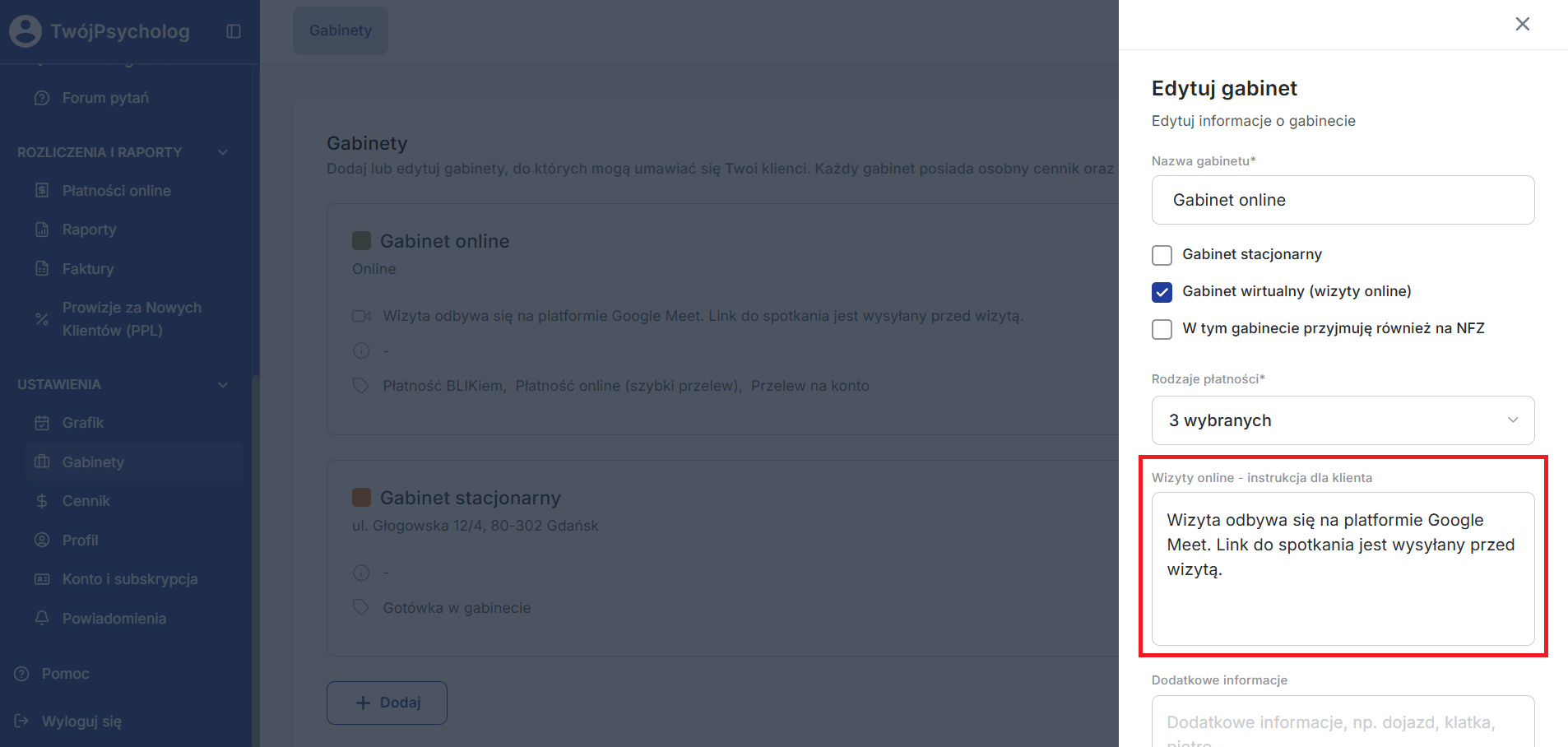 Jeśli zaznaczona jest opcja “Gabinet wirtualny (wizyty online)", dostępne do uzupełnienia jest również pole ”Wizyty online - instrukcja dla klienta".