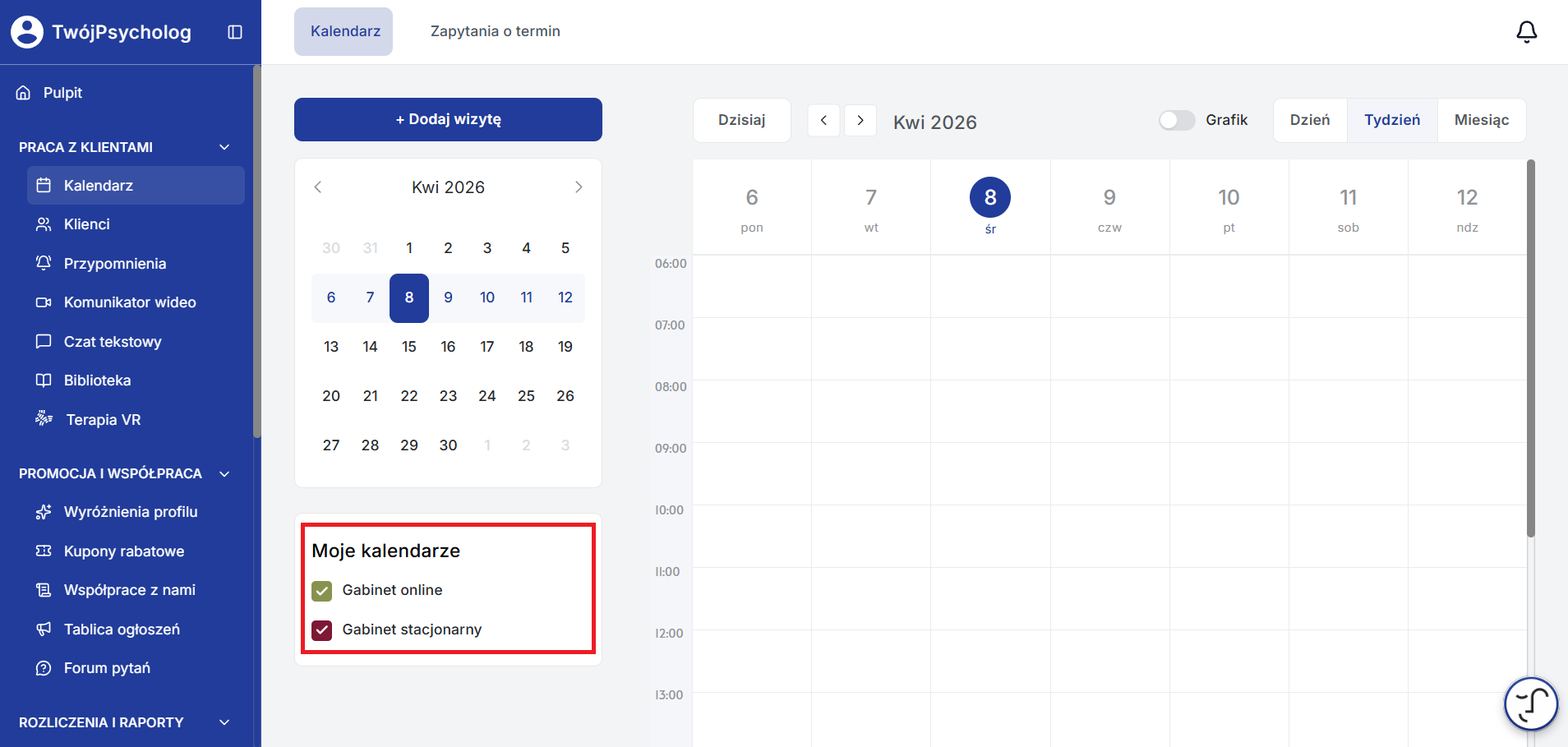 W Kalendarzu jest opcja zarówno wyświetlania wszystkich gabinetów naraz, jak i każdego osobno. Każdy gabinet jest oznaczony innym kolorem. Możesz zaznaczyć, który gabinet chcesz wyświetlać.