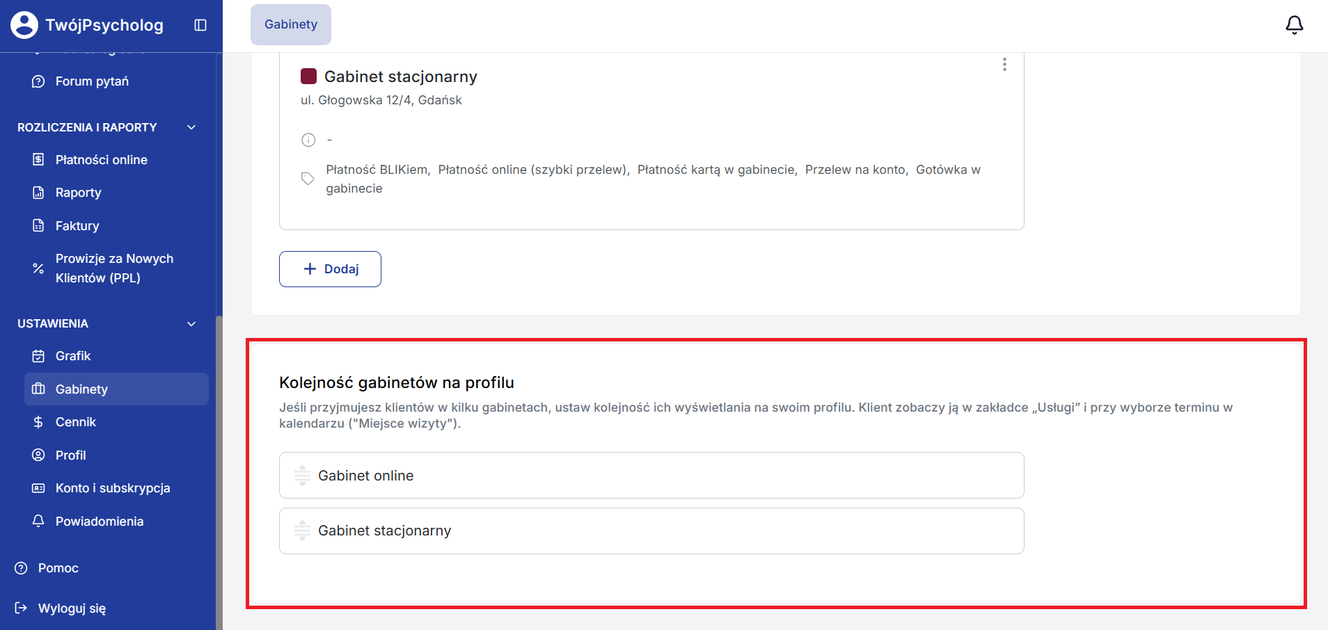 Aby to zrobić, w zakładce Gabinety, w sekcji “Kolejność gabinetów na profilu” (dostępna pod listą gabinetów) kliknij i przytrzymaj lewy przycisk myszki, przesuwając wybrany gabinet w górę lub w dół.