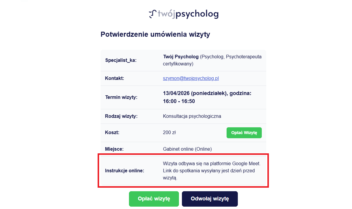 Więcej o polach “Wizyty online - instrukcja dla klienta” oraz “Dodatkowe informacje”, przeczytasz niżej.
