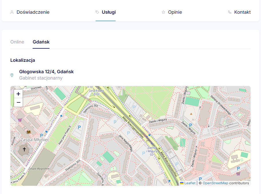 Mapa ta wyświetli się na Twoim profilu, w zakładce “Usługi”, co pomoże Twoim Klientom_tkom w odnalezieniu Twojego gabinetu.