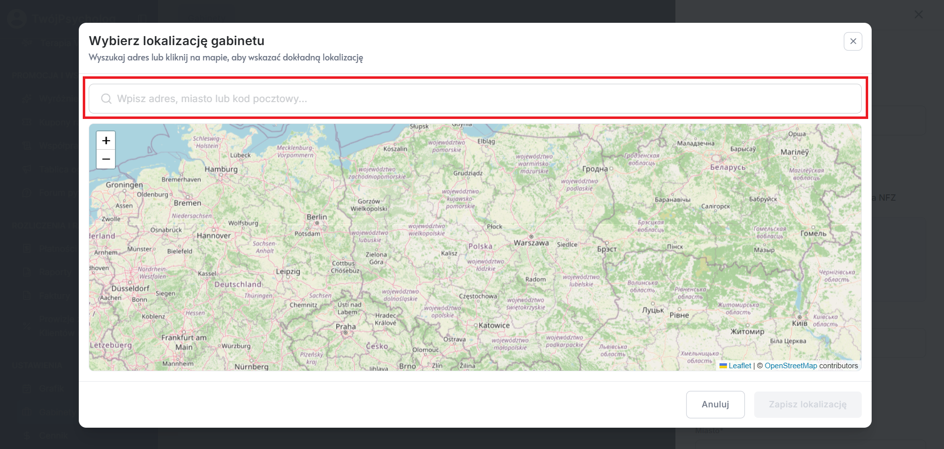 Uwaga! W przypadku dodania nowego gabinetu, lokalizację na mapie będziesz mógł_mogła dodać po zapisaniu gabinetu.