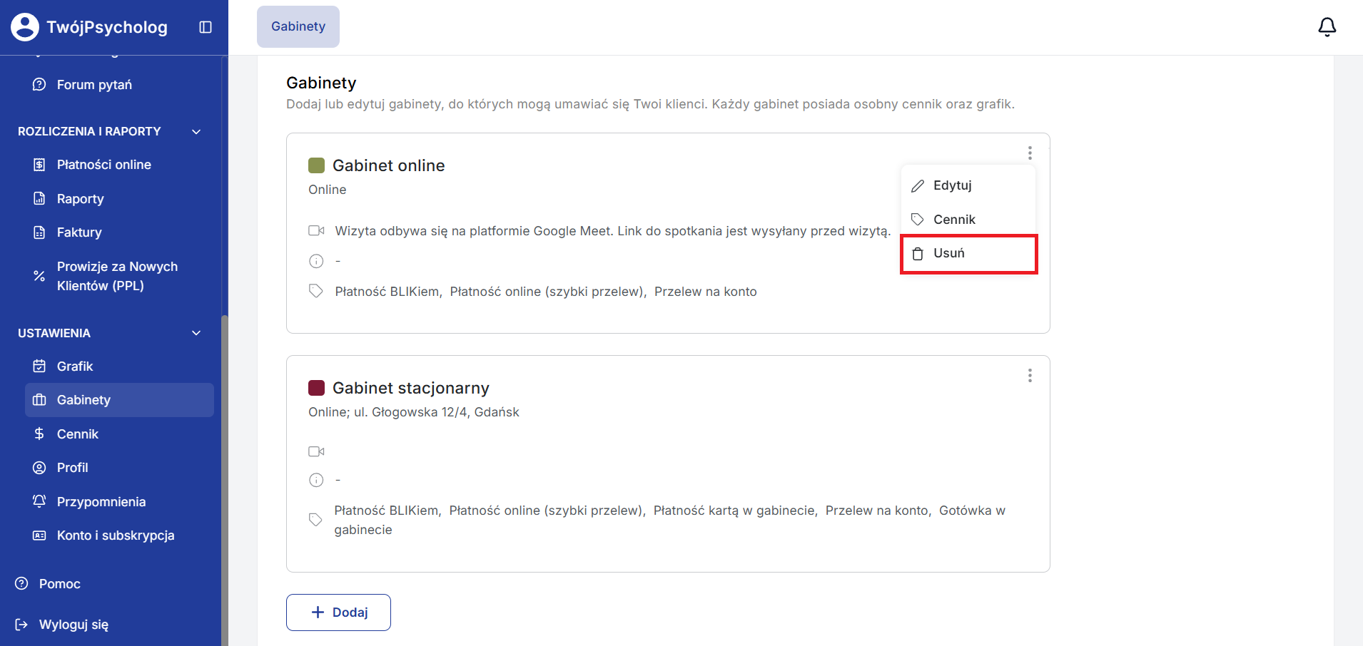 Podobnie jak powyżej, kliknij ikonę trzech kropek, znajdującą się przy danym gabinecie i wybierz opcję “Usuń”.