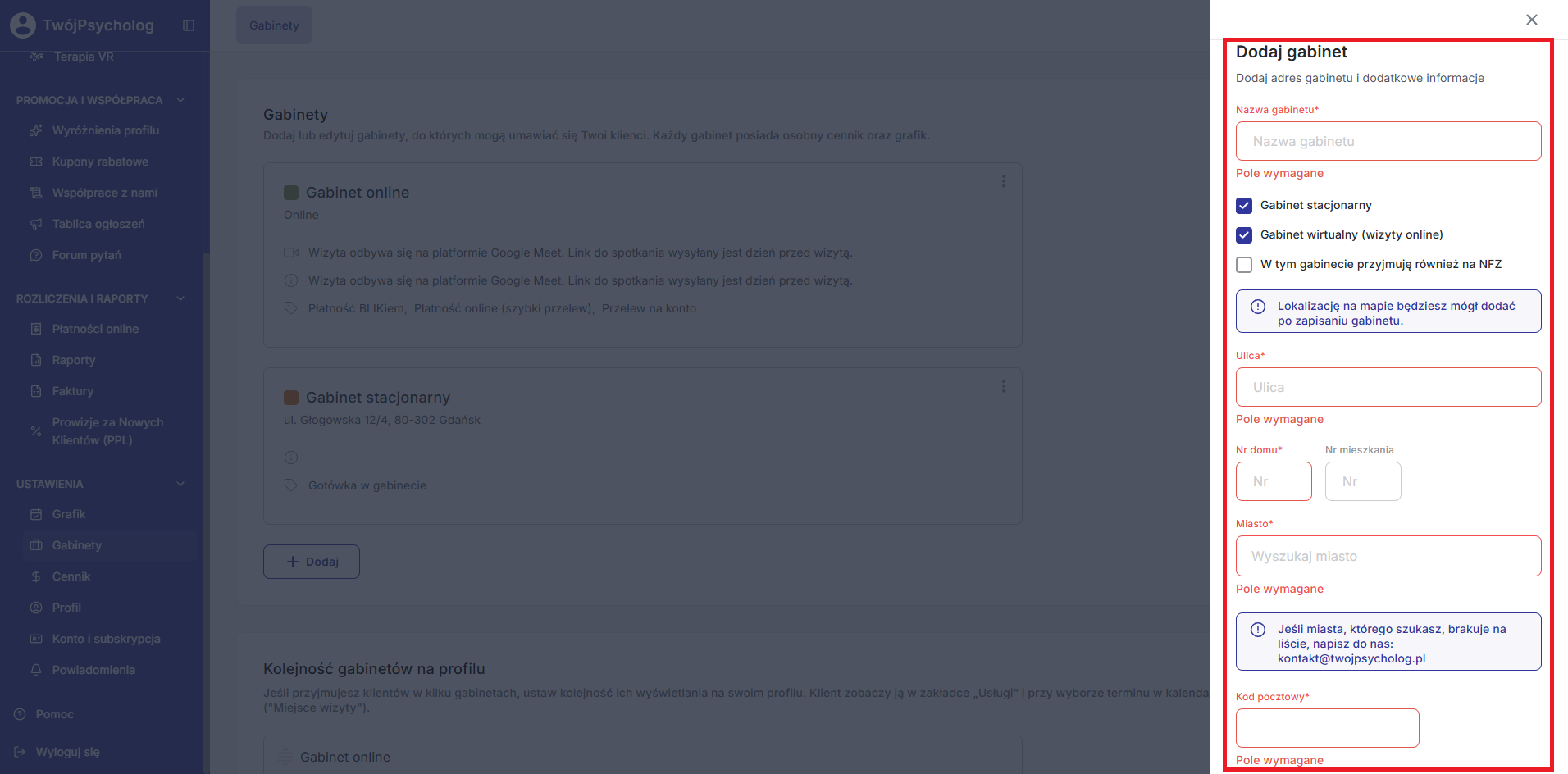 Jeśli któreś z wymaganych pól nie zostało uzupełnione, zostanie ono podświetlone na czerwono, wraz z informacją “Pole wymagane” a opcja zapisania gabinetu przyciskiem “Zapisz” nie będzie możliwa - po jego kliknięciu zostaniesz przeniesiony_na do pierwszego wymaganego pola, które nie zostało uzupełnione.