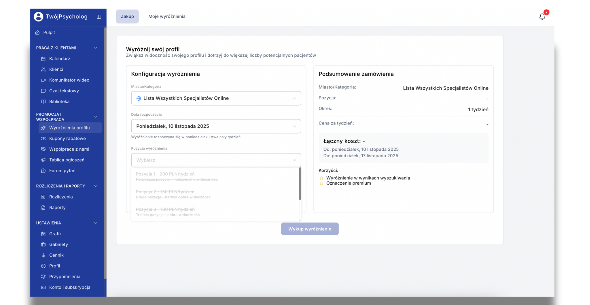 Wyróżnienie profilu to funkcja, która znacząco wpływa na widoczność Twojego gabinetu na platformie TwojPsycholog.pl i pomaga w dotarciu do osób poszukujących wsparcia.